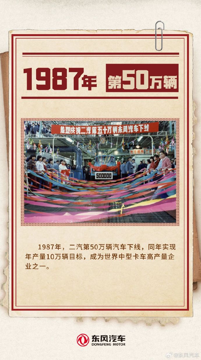 1987 年,二汽第 50 万辆汽车下线,同庚完结年产量 10 万辆指标