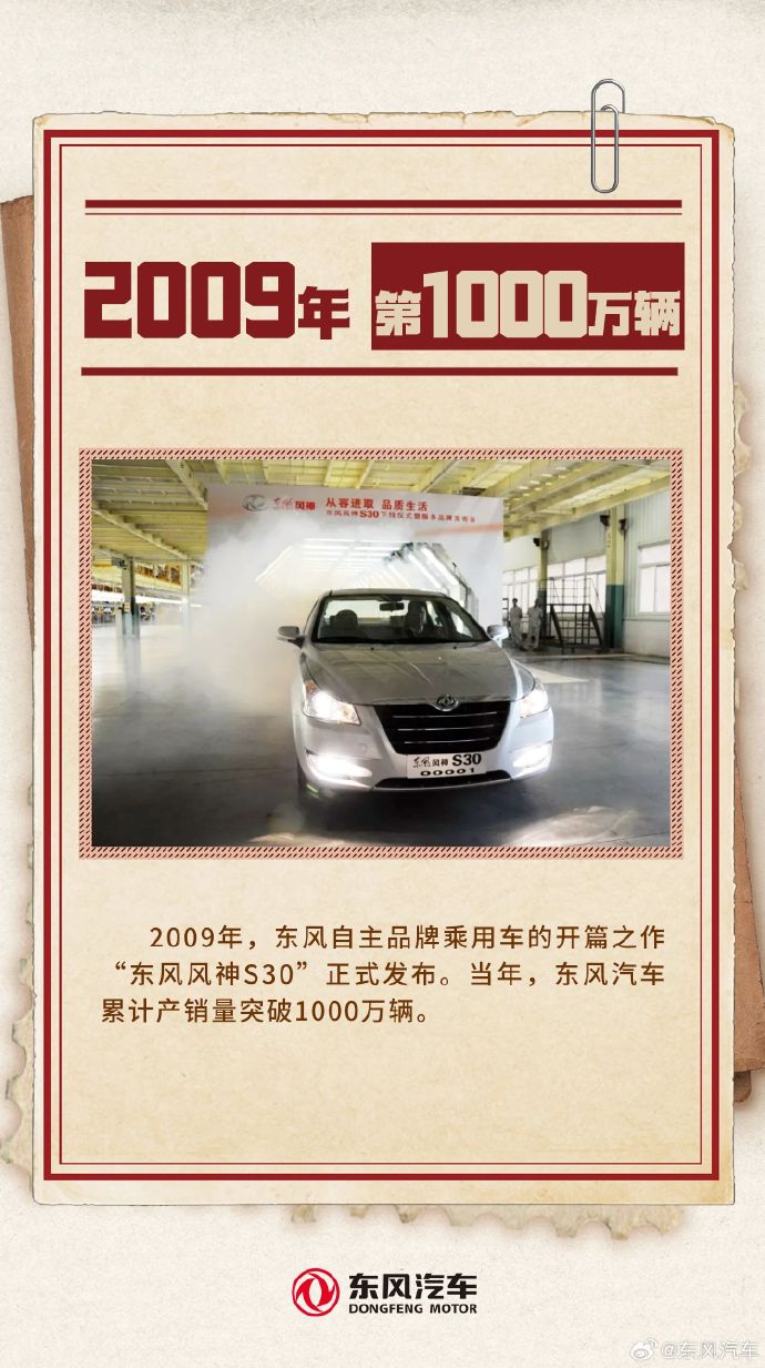 2009 年,东风风神 S30 发布。曩昔,东风汽车累计产销量冲破 1000 万辆